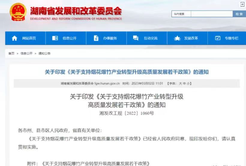 今天湖南省發(fā)改委官網(wǎng)公布關(guān)于印發(fā)《關(guān)于支持煙花爆竹產(chǎn)業(yè)轉(zhuǎn)型升級(jí)高質(zhì)量發(fā)展若干政策》的通知具體內(nèi)容如下: